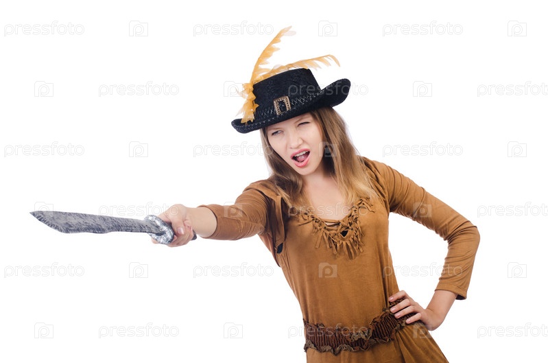 Женщина в костюме пирата с ножом, изолированная на белом фоне