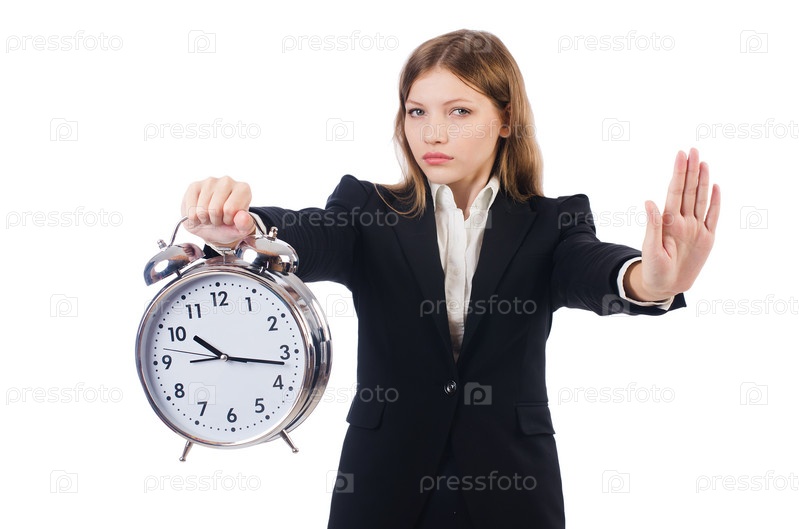 Бизнес-леди с часами, изолированная на белом фоне