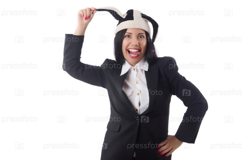Бизнес-леди в клоунском колпаке, изолированная на белом фоне