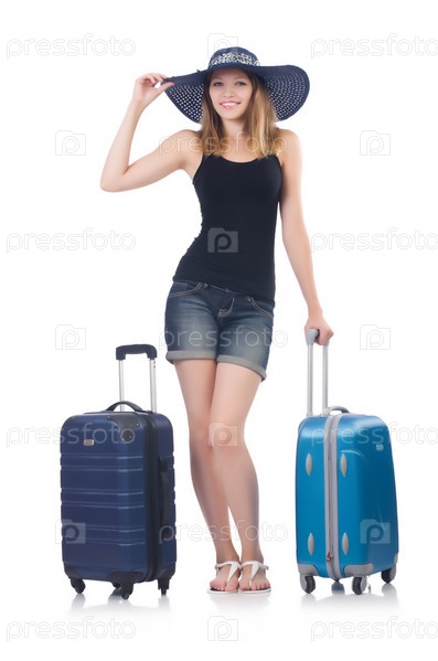 Женщина с чемоданами на белом фоне