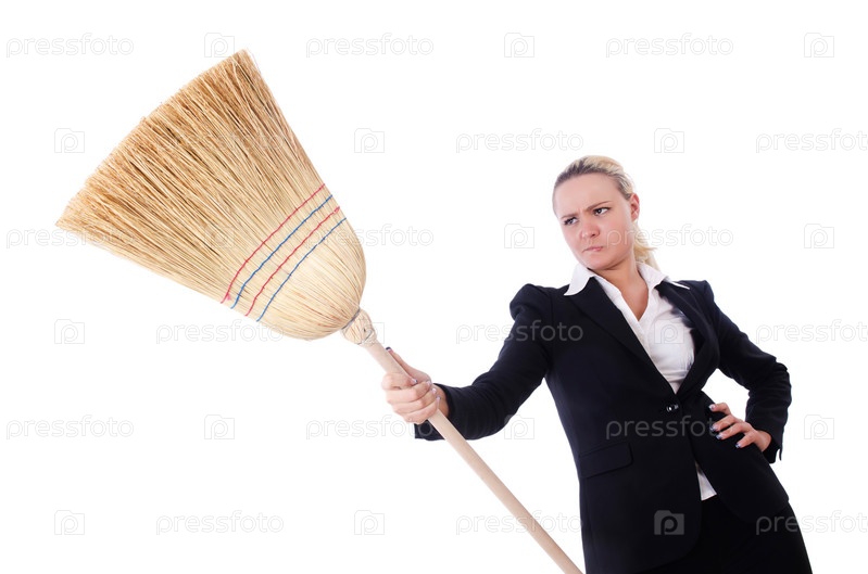 Бизнес-леди с метлой, изолированная на белом фоне
