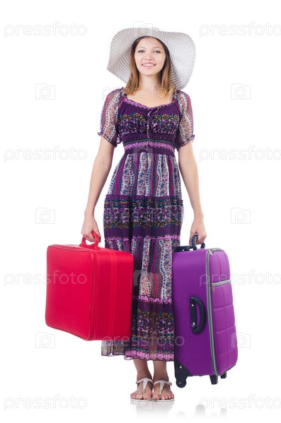 Женщина с чемоданами на белом фоне