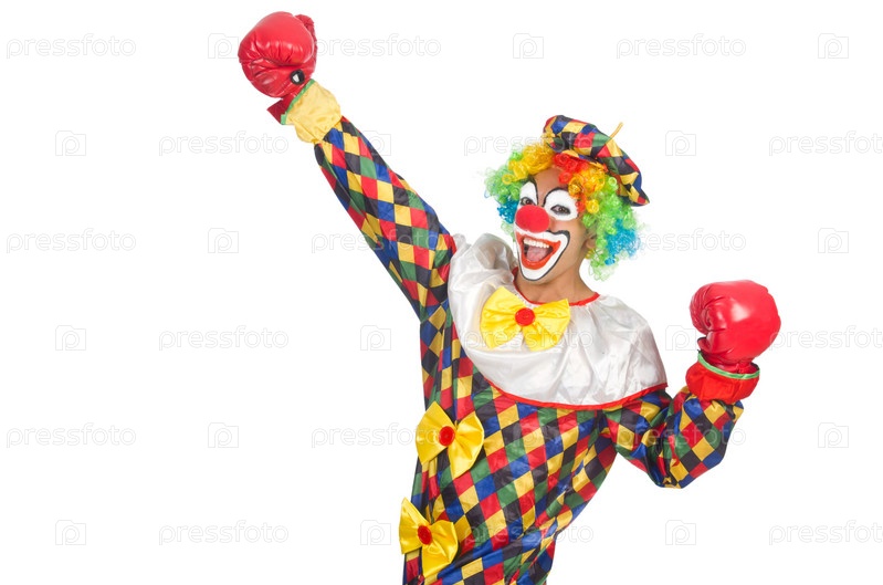 Клоун в боксерских перчатках, изолированный на белом фоне