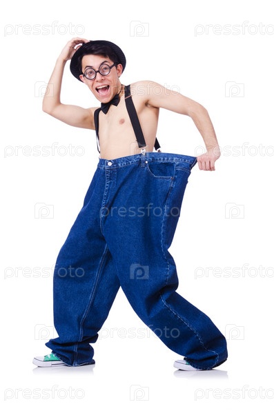 Забавный мужчина с брюками, изолированный на белом фоне