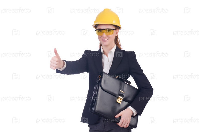 Бизнес-леди в каске на белом фоне