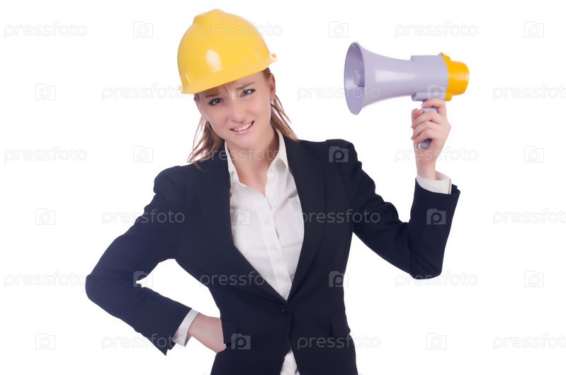 Бизнес-леди в каске на белом фоне