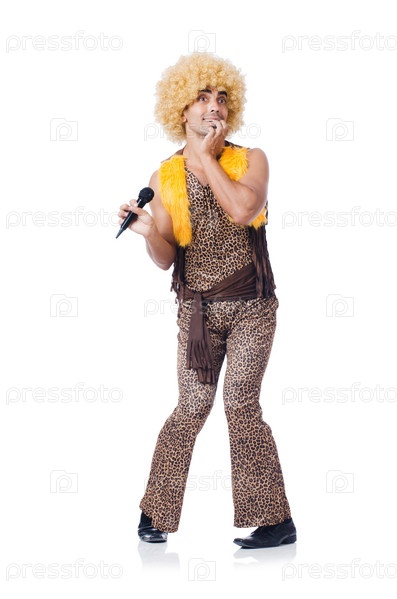 Человек с афро держит микрофон, изолированный на белом фоне