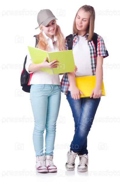 Пара молодых студентов на белом фоне