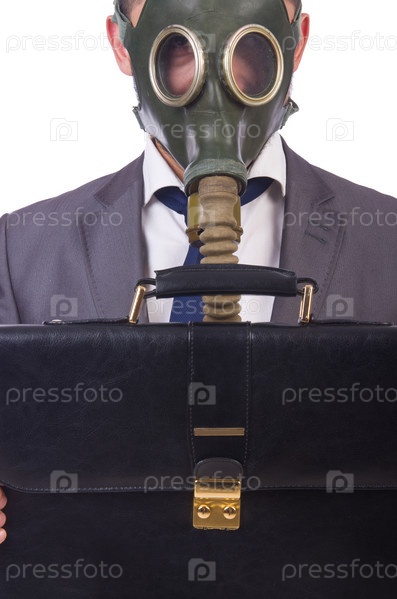 Бизнесмен в противогазе, изолированный на белом фоне