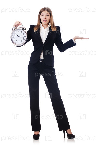 Бизнес-леди с часами, изолированная на белом фоне