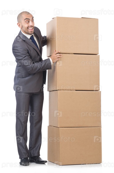 Бизнесмен с коробкой, изолированный на белом фоне