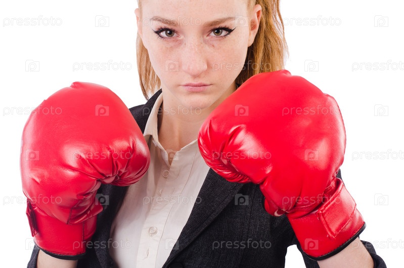 Деловая женщина в боксерских перчатках на белом фоне