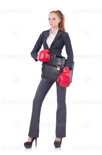 Деловая женщина в боксерских перчатках на белом фоне