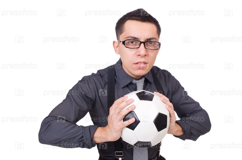 Забавный мужчина с футбольным мячом, изолированный на белом фоне