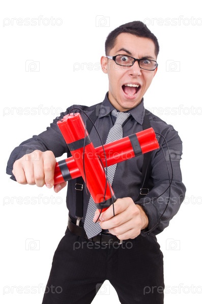 Бизнесмен с динамитом, изолированный на белом фоне