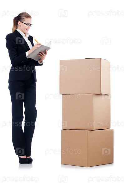 Бизнес-леди с коробками, изолированная на белом фоне