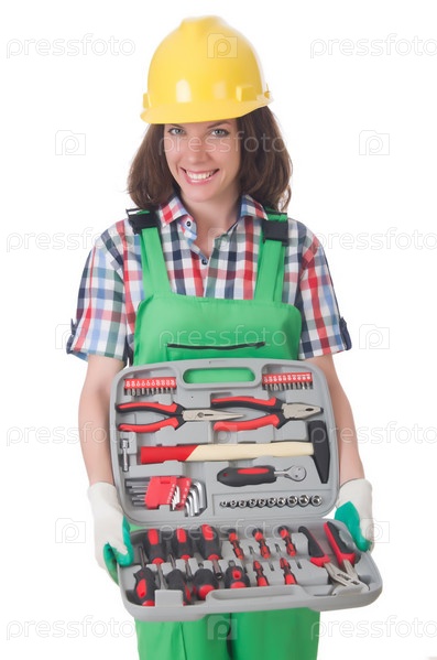 Молодая женщина с инструментами на белом фоне