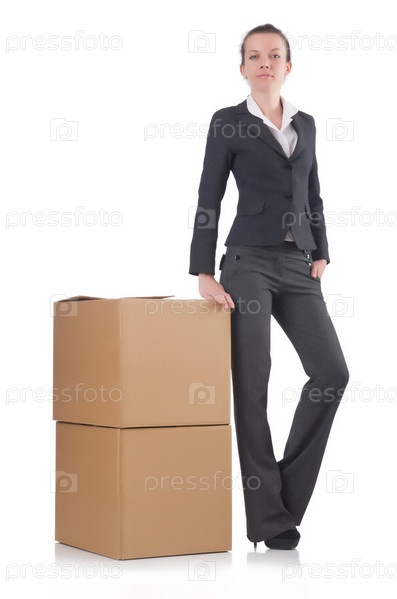 Деловая женщина с коробками на белом фоне