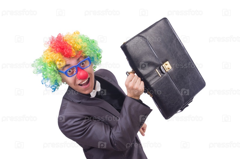 Клоун-бизнесмен, изолированный на белом фоне