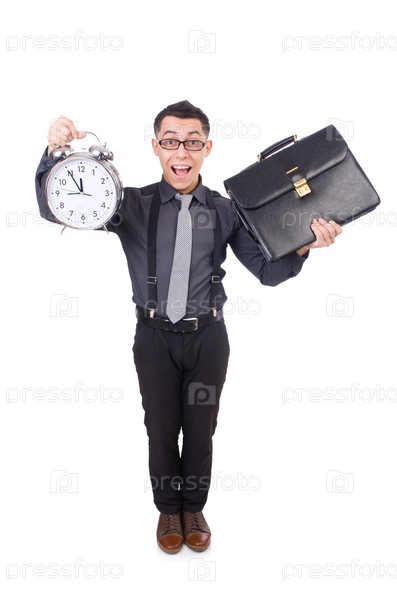 Смешной бизнесмен с часами, изолированный на белом фоне