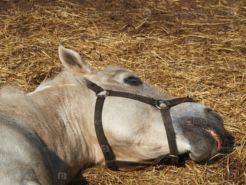 Лошадь спит на сене