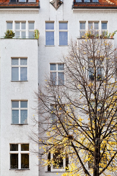Фасад жилого дома и желтая липа