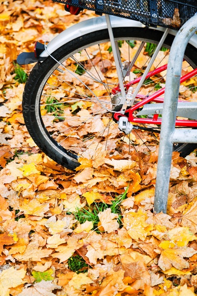 Колесо велосипеда в осенних листьях