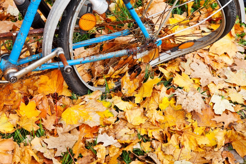 Поврежденное колесо велосипеда в осенних листьях