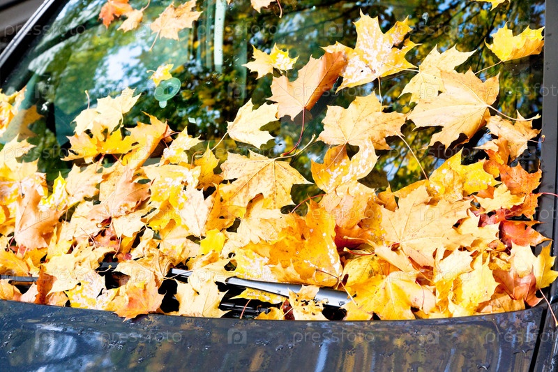 Осенние листья на капоте синего автомобиля