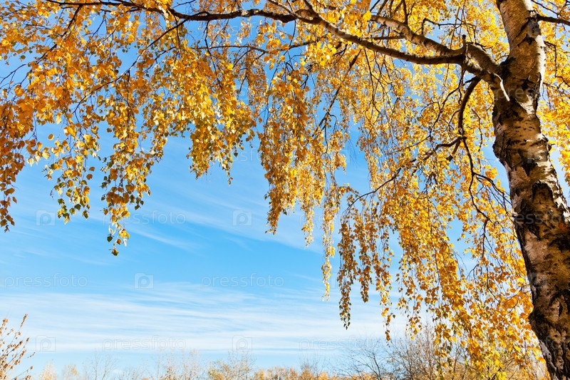 Ветка березы с желтыми листьями на фоне голубого неба
