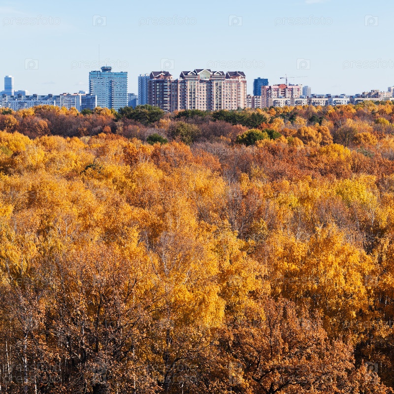 Городские здания на опушке осеннего леса