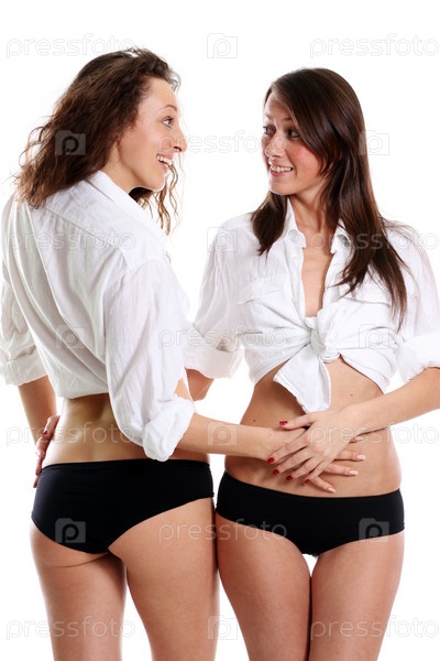 Две брюнетки в черных плавках на белом фоне