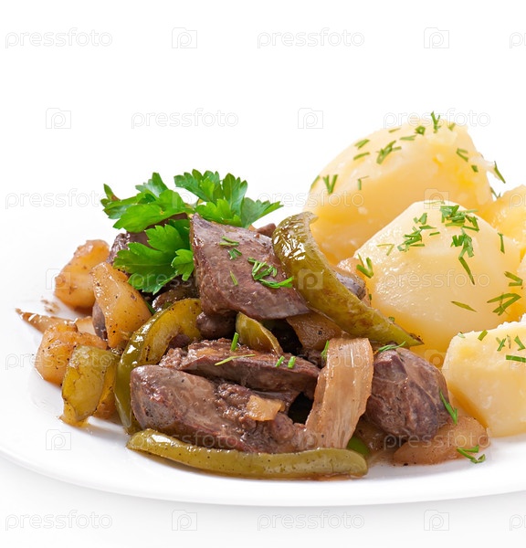 Жареная куриная печень с яблоками, сладким перцем и луком