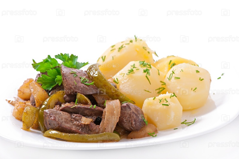 Жареная куриная печень с яблоками, сладким перцем и луком