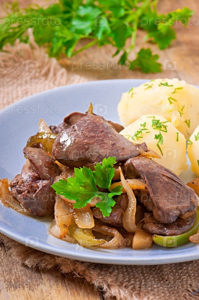 Жареная куриная печень с яблоками, сладким перцем и луком