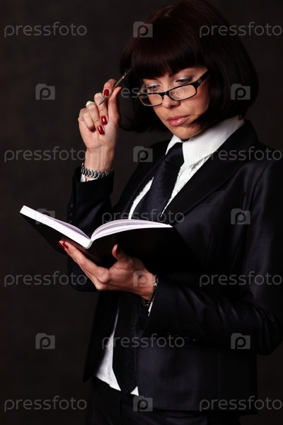Деловая девушка в галстуке с блокнотом на черном фоне