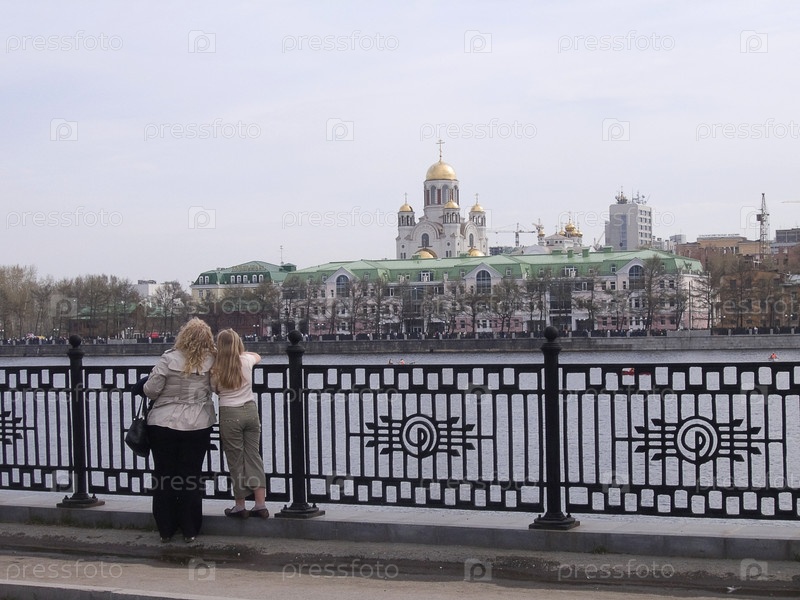 Город Екатеринбург.Женщина и девочка на берегу реки Исеть.Храм На Крови в фоне