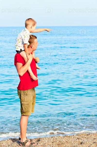 Сын показывает что-то отцу в море