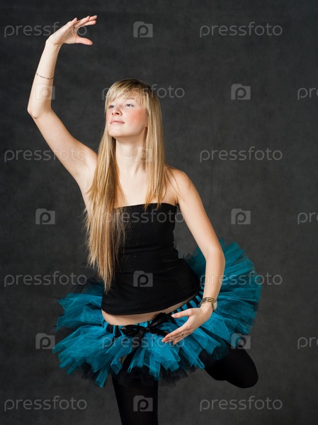 Молодая красивая танцовщица со светлыми волосами на темном студийном фоне