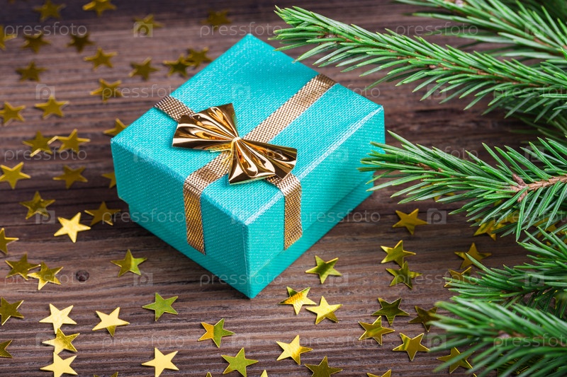 Рождественский подарок со звездами и хвойной ветвью на деревянном столе