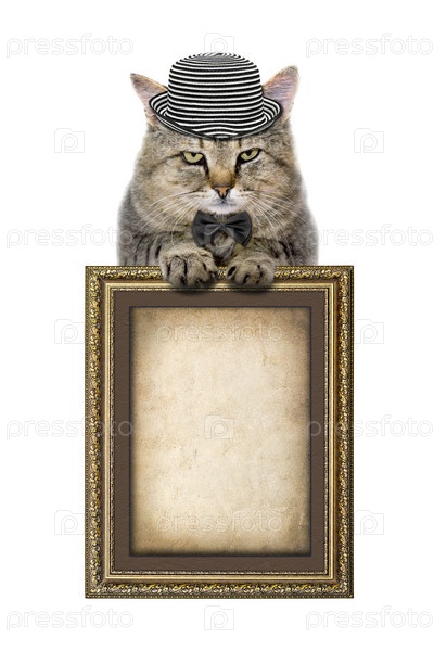 Кот в шляпе и галстуке-бабочке опирается на картинную раму, изолированный на белом фоне