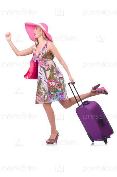 Девушка с чемоданами, изолированная на белом фоне