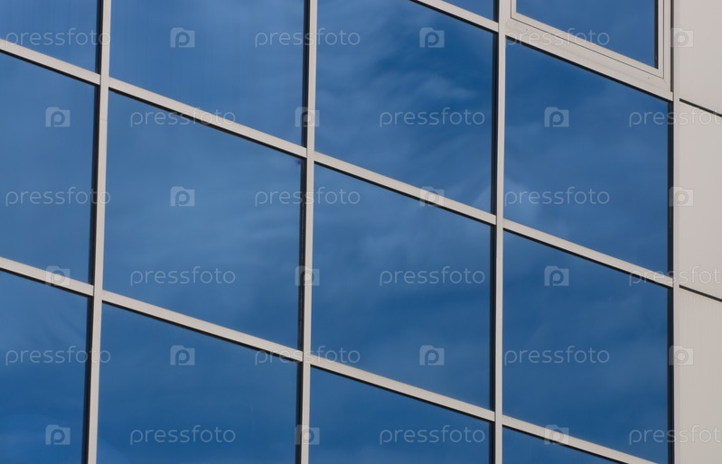Окно, отражающее голубое небо и облака