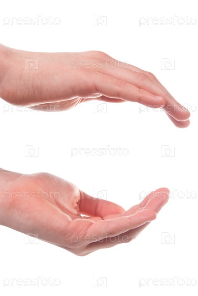 Две мужские руки держат что-то на белом фоне