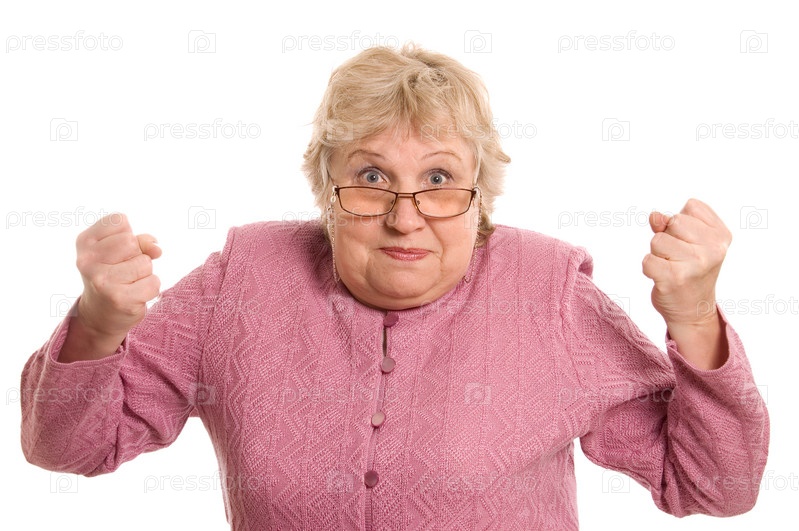 Пожилая женщина показывает кулаки