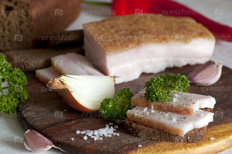 Нарезанное соленое сало с ржаным хлебом, чесноком, перцем и луком