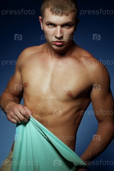 Мускулистый молодой мужчина в студии на синем фоне