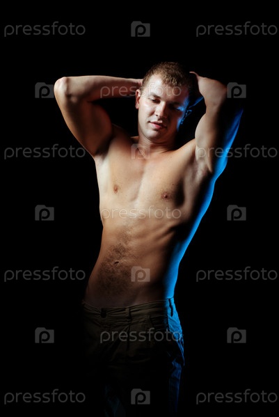 Мускулистый молодой мужчина в студии на синем фоне