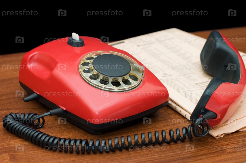 Старый красный телефон и газета на столе