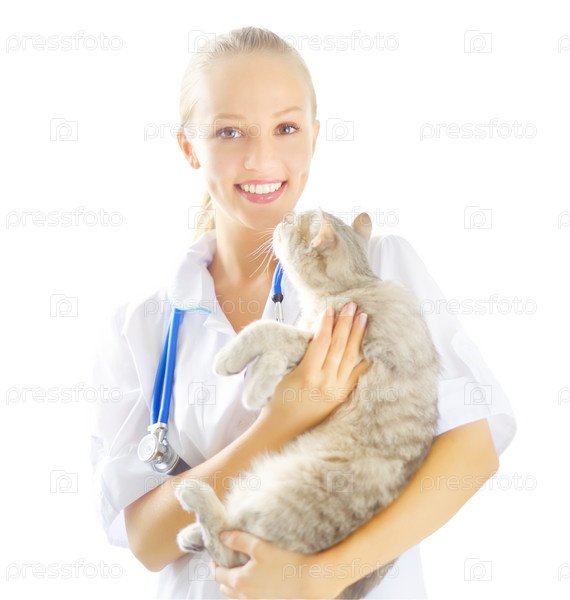 Ветеринар с шотландской кошкой, изолированные на белом фоне